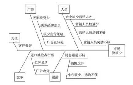 圖中的“魚頭”表示需要解決的問題,即該煉油廠產(chǎn)品在市場中所占份額少。根據(jù)現(xiàn)場調(diào)查,可以把產(chǎn)生該煉油廠市場營銷問題的原因,概括為5類。即人員、渠道、廣告、競爭和其它。在每一類中包括若干造成這些原因的可能因素,如營銷人員數(shù)量少、銷售點少、缺少宣傳策略、進口油廣告攻勢等。
