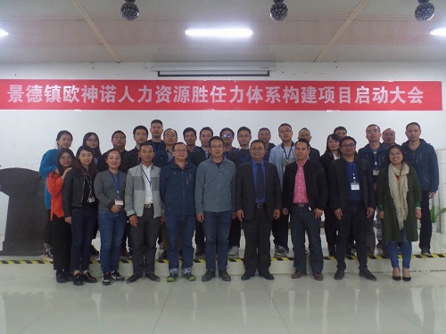 2017年11月3日上午,歐神諾陶瓷集團景德鎮基地公司再次攜手優制咨詢,在兩基地同時開展新的合作之旅——《人力資源勝任力體系構建》項目。項目啟動大會在行政樓會議室隆重召開。公司總經理龐總、副總經理吳總、趙總,各部門管理層及全體項目成員參加了會議,優制咨詢副總經理郭老師、咨詢總監魏老師出席了本次項目啟動大會。