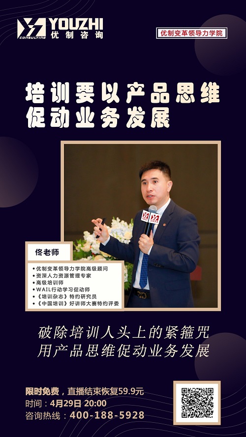4月29日20:00-20:45,優制變革領導力學院顧問佟老師提出一個全新的理念:如何用產品思維去做培訓項目,讓培訓真正能夠成為業務的促動者!