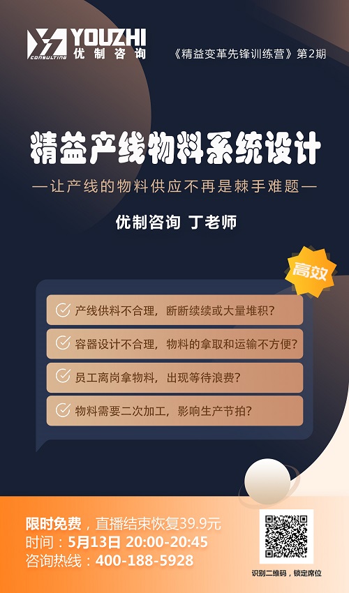 出現(xiàn)以上問(wèn)題的主要原因之一,就是缺乏對(duì)產(chǎn)線物料供應(yīng)系統(tǒng)的精益設(shè)計(jì)。如何做到既不影響生產(chǎn)節(jié)拍,又能保證產(chǎn)線的物料庫(kù)存水平維持在低位?5月13日晚20:00,優(yōu)制咨詢丁老師教你科學(xué)地設(shè)計(jì)精益產(chǎn)線物料系統(tǒng),讓產(chǎn)線的物料供應(yīng)不再是棘手難題!