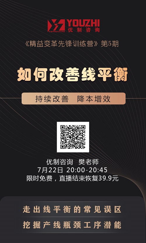 7月22日20:00-20:45,優(yōu)制咨詢樊老師教你如何走出線平衡的常見誤區(qū),挖掘產(chǎn)線瓶頸工序潛能。