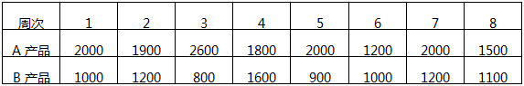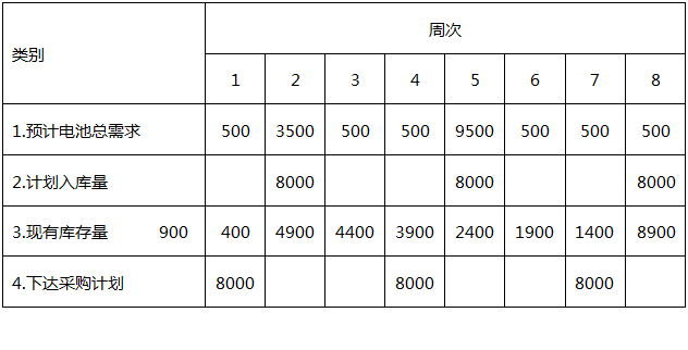 案例:某公司是一家生產手機的制造商。兩種款型的產品A和B,都是用同一種電池CP-820,由于這些電池在使用過程中會損耗,就會出現更換電池的獨立需求,需求量為每周500單位。此公司以最小生產批量組裝A和B產品,電池則按最低采購量從外部供應商購買。未來8周內A和B產品的預計需求量見下表: