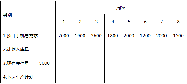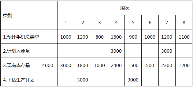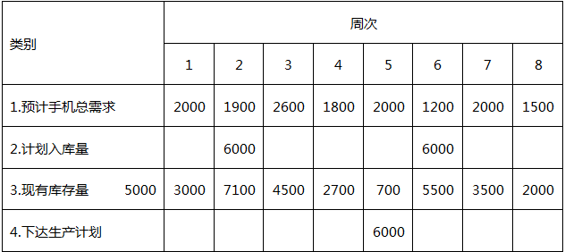為了滿足最終產品的需求,需要編制產品的生產進度來說明什么時候開始生產手機,該生產多少。首先從第1周開始,從現有庫存中扣減第1周的需求量,記錄下剩余庫存,在以后的各周中不斷重復這一過程,直到預計的現有庫存量降為零。此時,需要從已完工的產品中補進,由于生產周期為1周,所以需要提前1周下達生產計劃。完成后的MRP表如下: