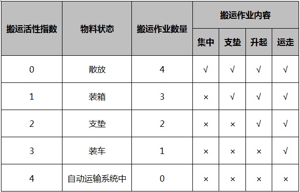 搬運活性指數是表現搬運工作難易程度的指數,搬運活性指數越高搬運作業越容易;反之,搬運活性指數越低,說明搬運工作越困難。一般來說我們搬運對象可以分為四種存放狀態: